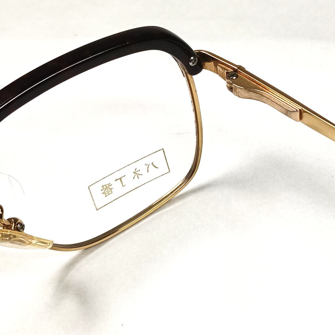 今では数少なくなったサーモント(ブロータイプ)フレームです。サーモントの樹脂部分は黒く見えますが実際はごく暗いブラウンで、薄っすら模様が入っています。一般に「デミ」と呼ばれます。