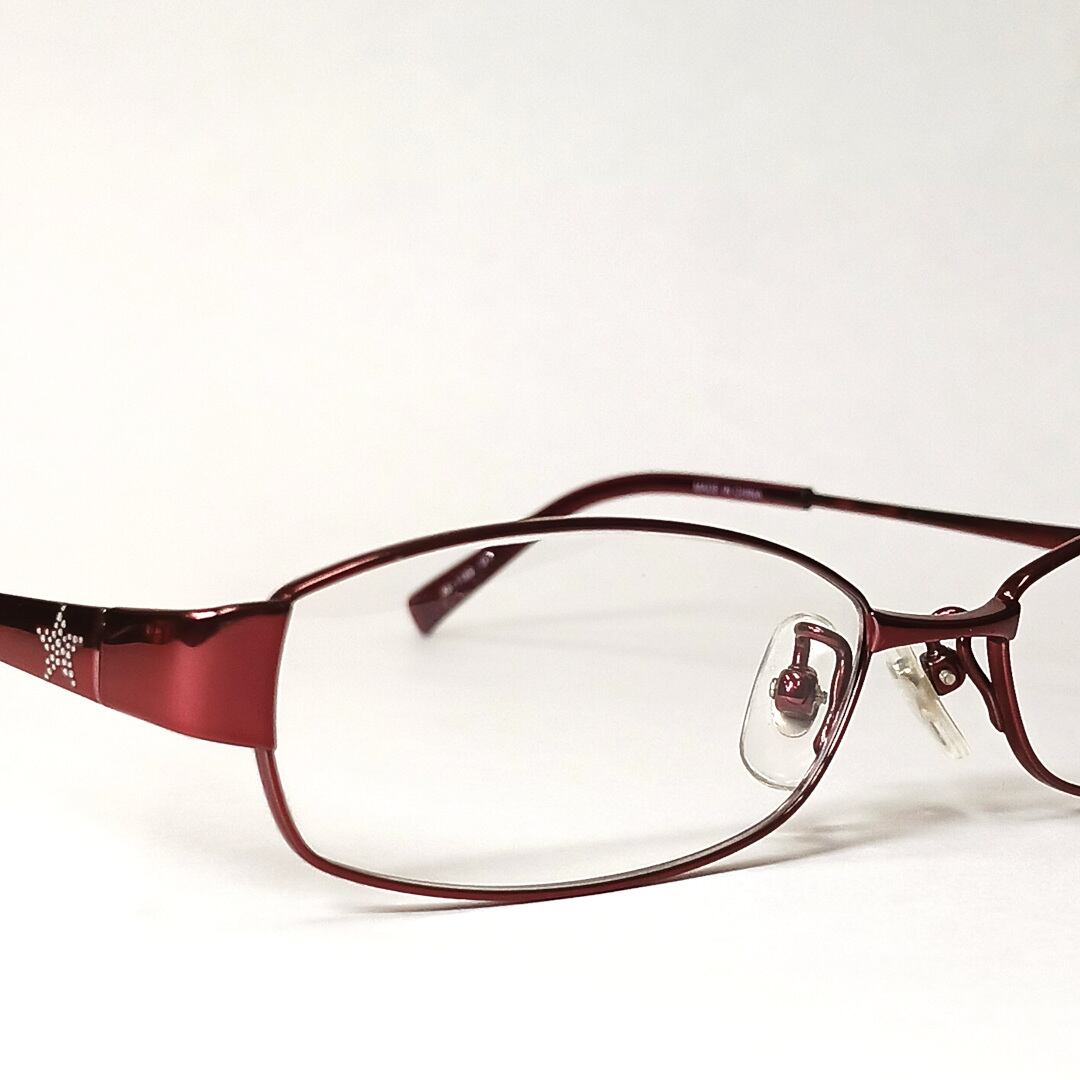玉型は天地幅の狭いオーバル型で、男女どちらでもかけて頂けるシェイプです。フレームカラーはダークレッド色、モダン(つるの先端の樹脂)はメタル部分に合わせたワイン色になっています。