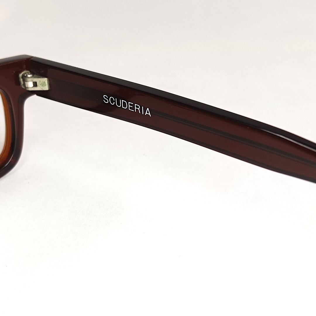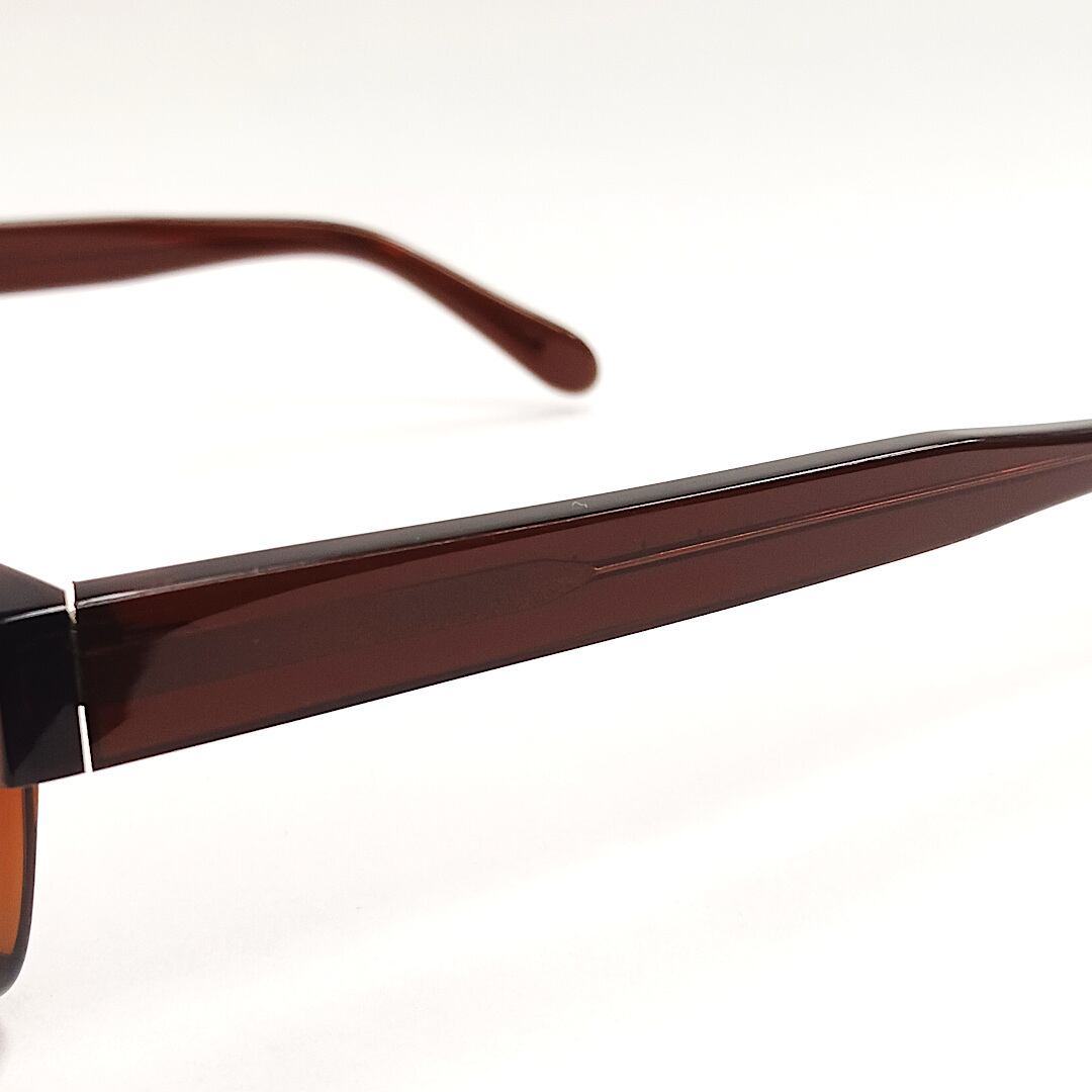 フレームは透明感あるブラウンの生地で、中の心棒が透けて見えます。とても美しいフレームです。また、横に長いスクエアー型というフロント形状も特徴的です。