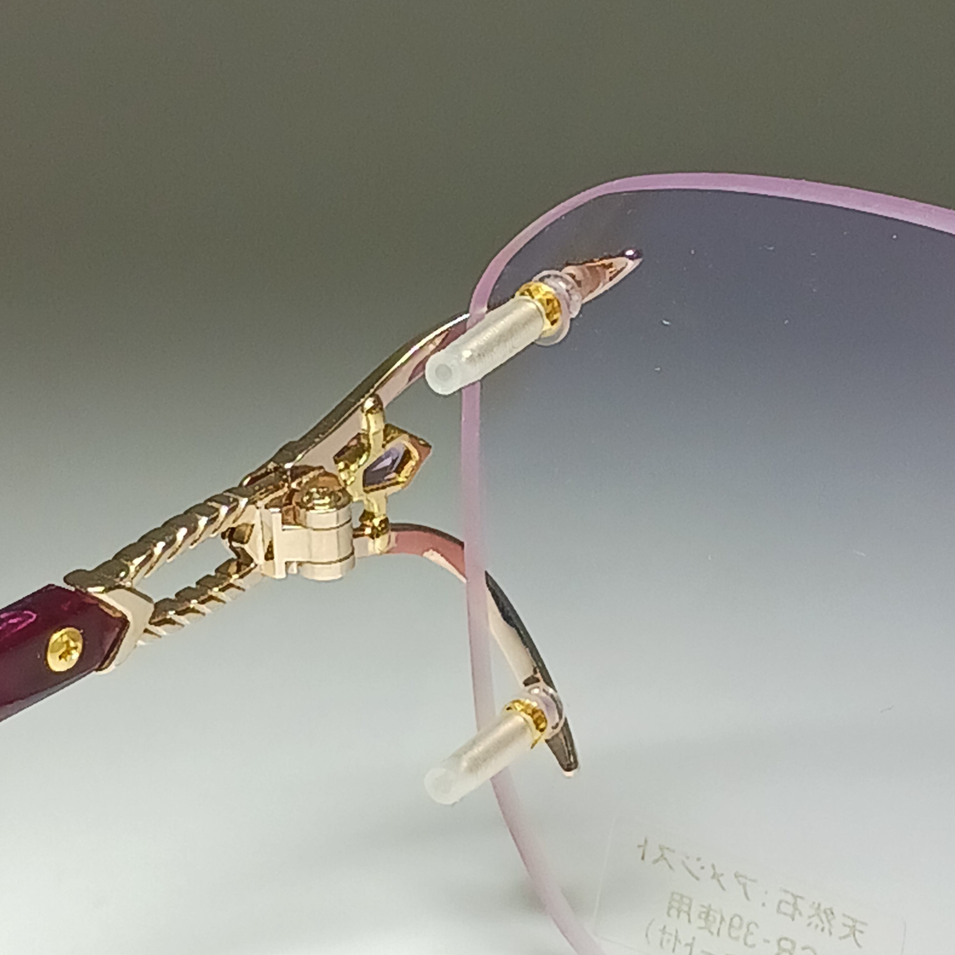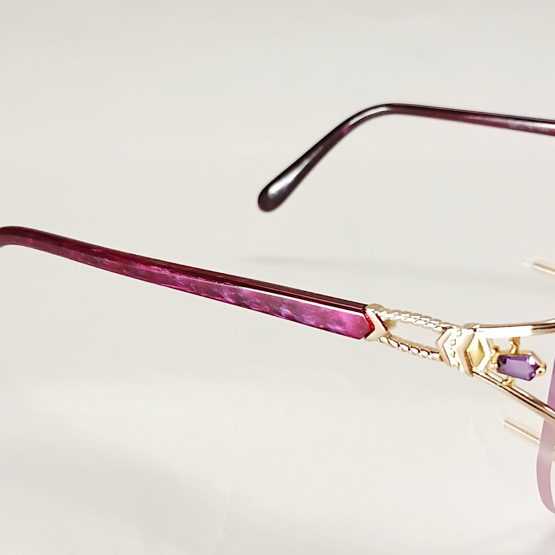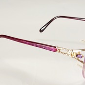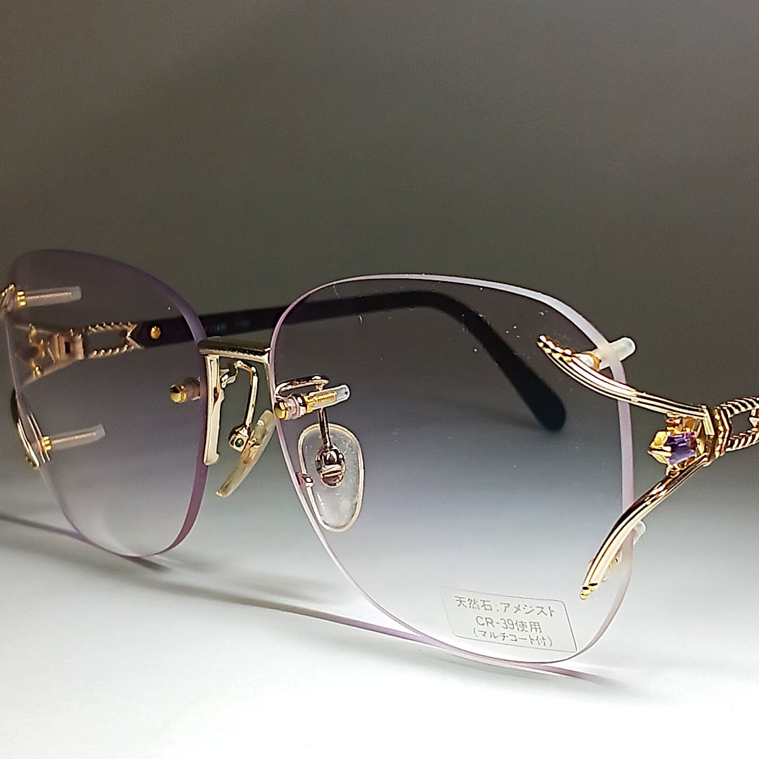 智金具に大き目の天然のアメジストが埋め込まれており、気品を感じさせます。またレンズも薄っすらとアメジストによく似たカラーで染色されています。