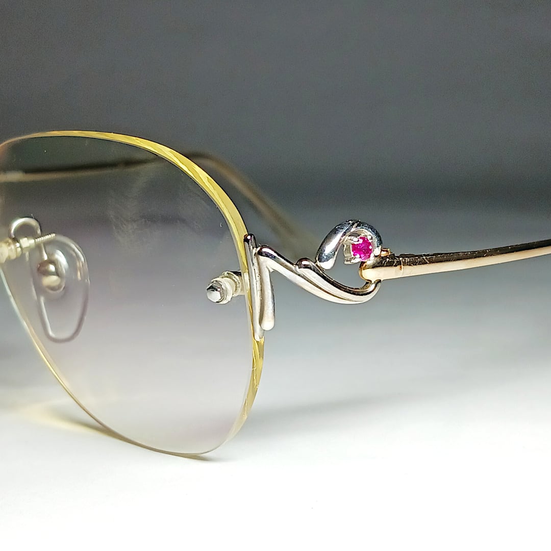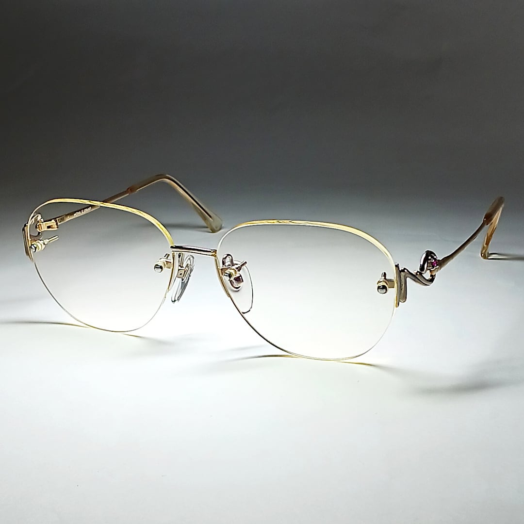 左側の智金具にルビーをあしらった美しいフレームで、アイジュエリーというHOYAの高級レディースフレームになります。